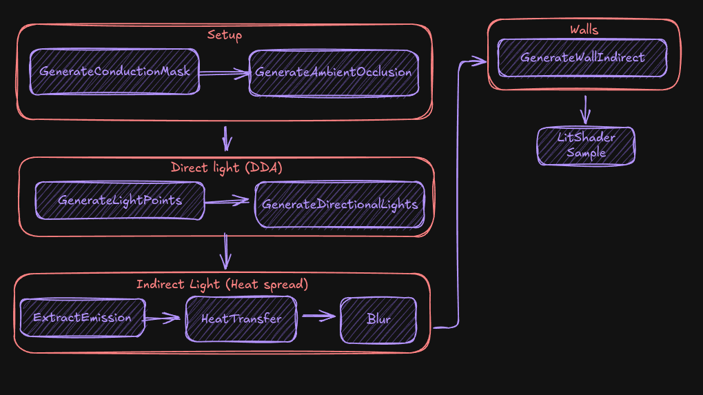 It’s inspired by Core Keeper’s own lighting system (which uses heat diffusion in their pipeline) and David Maletz’s work on I Can’t Escape: Darkness. His blog post was the foundation for the indirect lighting approach.