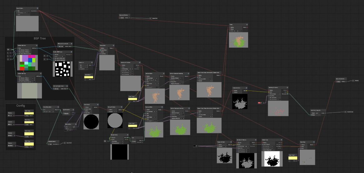 Forgive the spaghetti. Map generation is built on top of Map Graph and allows us to define rules and morph terrain using graph nodes. It supports various cellular automata functions, noise types, BSP trees, and more.