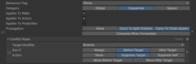 Doing it this way allows us to map complex interactions, like projectiles first bouncing and then splitting. It keeps the projectile entities lean and is deterministic by nature.
